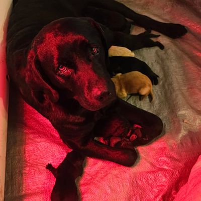 This beautiful pairing produced 6 males and 2 females, all with rich chocolate coats, blocky builds, and sweet, loving temperaments.
